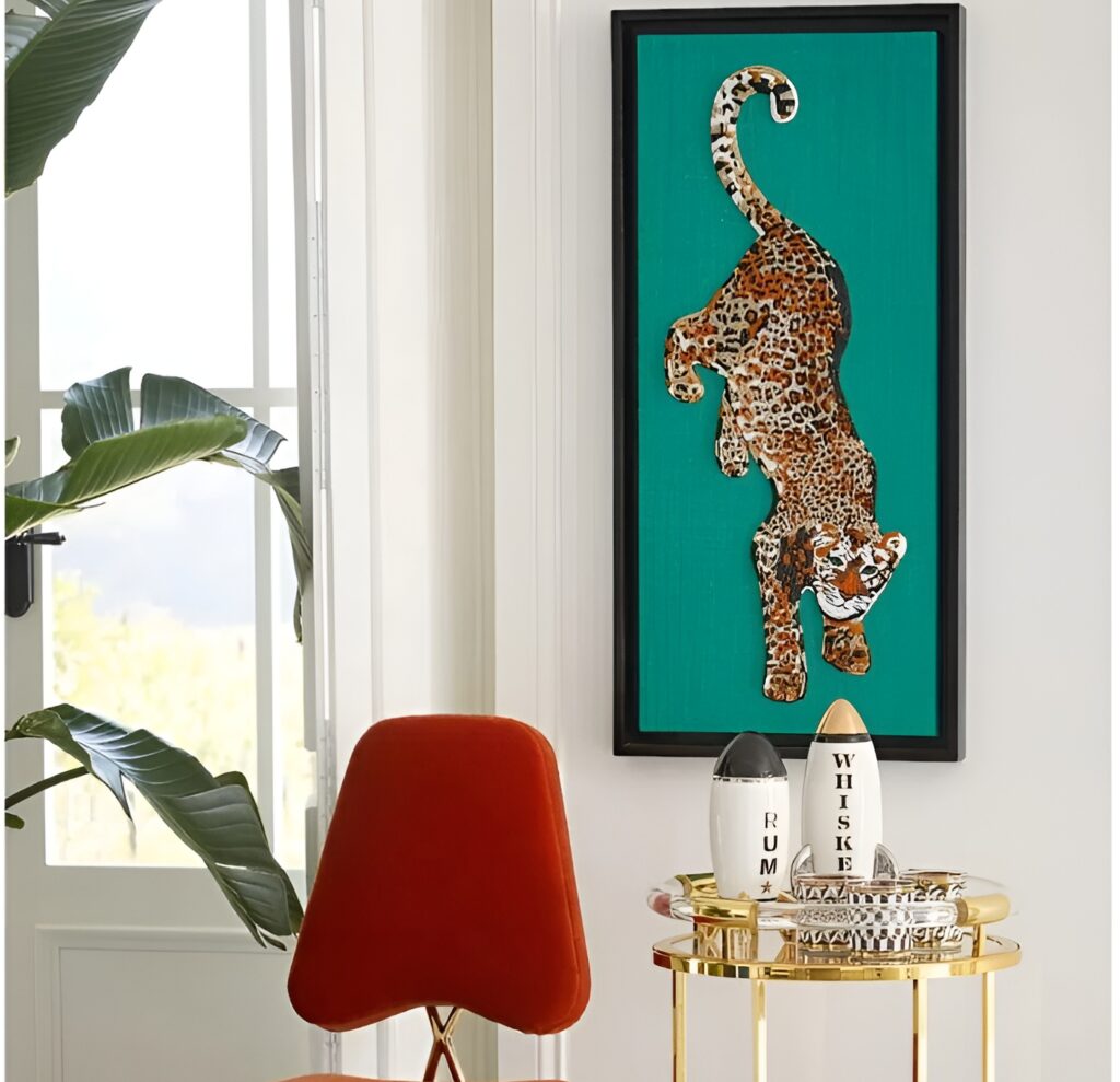 - Bold Colour Scheme: The background of emerald and the golden leopard spots are very contrasting.