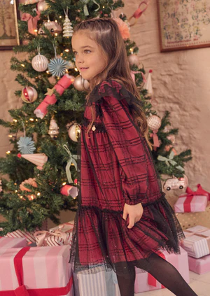 Make your little one shine at every occasion—shop the Tia Sequin Tartan Mesh Dress now!