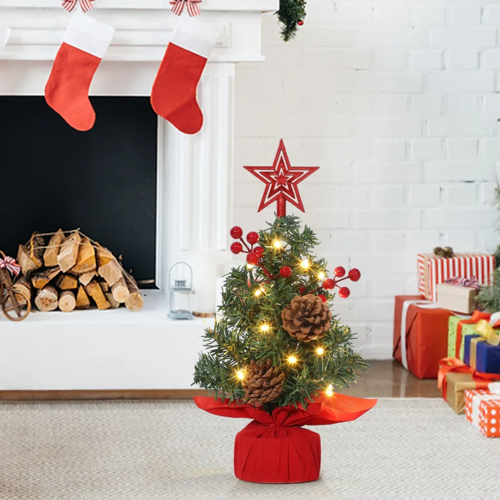 The mini tree is easy to set and can be decorated within a few minutes. Its solid foundation makes it stable, and the lights, combined with berries and pine cones, make the image look attractive and cheerful. This is a small but beautiful tree that offers a taste of beauty that supplements other holiday decorations. Its usability means that it can be used in the house, in the office, or in the classroom, and it will bring the holiday cheer to any place.