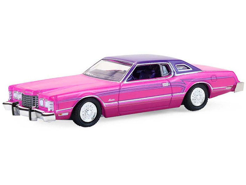 5. 1975 Ford Thunderbird Lowrider Pink Metallic with Purple Top and Graphics with Purple Interior “California Lowriders” Series 7 1/64 Diecast Model Car by Greenlight