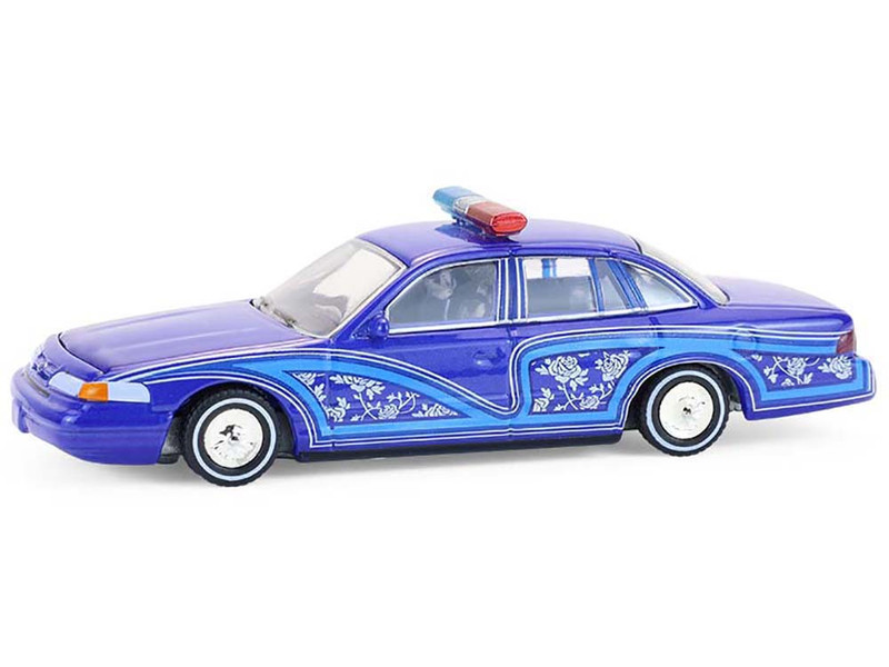4. 1992 Ford Crown Victoria Lowrider Blue with Graphics and Lightbar “California Lowriders” Series 7 1/64 Diecast Model Car by Greenlight