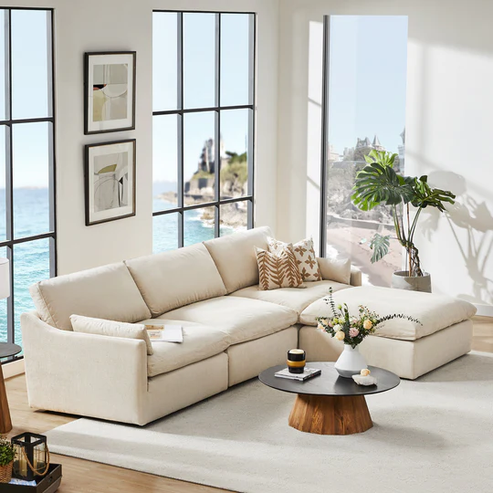 The Kenna Modular 4 Seat Sofa-Chaise Sectional represents the pinnacle of versatile family seating. With its cloud-like cushioning and generous proportions, this sectional invites everyone to stretch out completely. Perfect for open-concept homes or cozy apartments, the movable ottoman creates endless layout possibilities while the high-resiliency foam maintains shape for years.