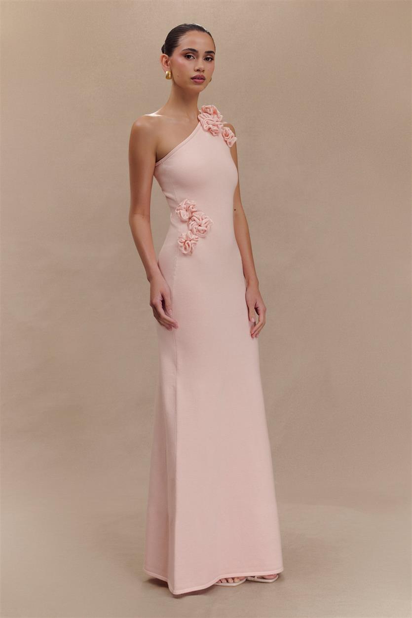 The PALOMA One Shoulder Knit Maxi Dress with Flowers by MESHKI is a masterpiece that combines modern trends with the elegant traditions of the beautiful; it looks luxurious. A cut-out technique on the neckline is creatively left with one side bare in this daring dress making a daring fashion statement. The slim and even somewhat girlish cut is contrasted very effectively by the floral decorations on the hip and the shoulders.