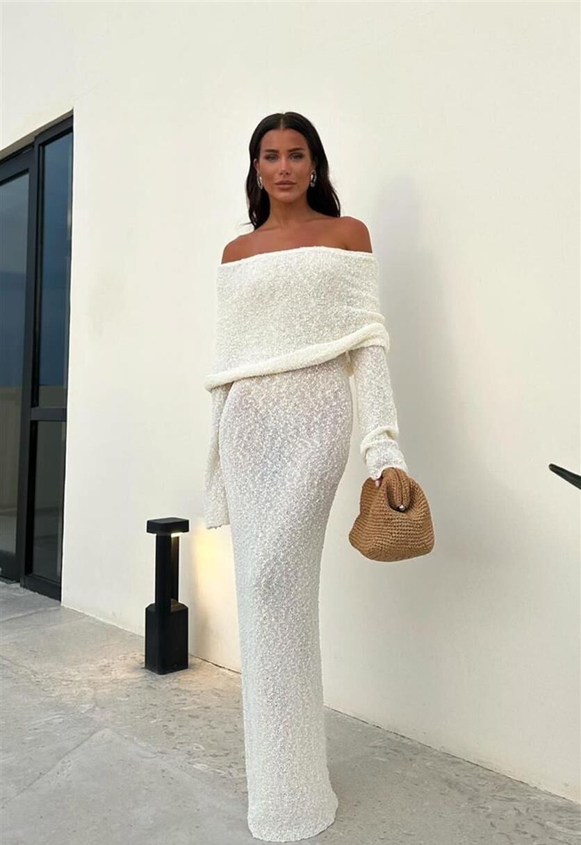 Experience the glamour of the MARISOL Off-Shoulder Boucle Maxi Dress at MESHKI – order now and turn your events into celebrations!
