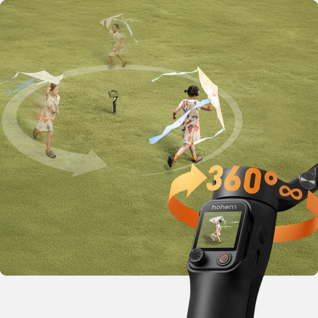 The Hohem iSteady V3 Ultra also has an infinite pan tracking of 360° which is designed to make sure your subject is in the frame even when you are in motion. It is ideal for taking long shots or tracking high-speed moving objects without losing track.