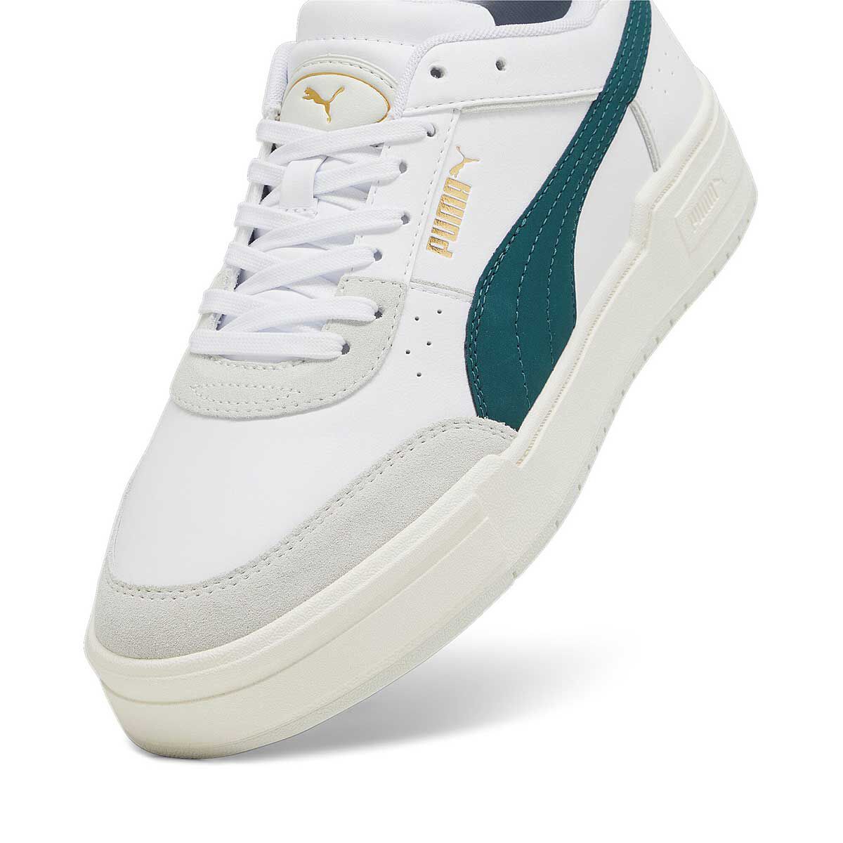 The PUMA CA PRO SPORT MIX sneakers in white and malachite blend sporty aesthetics with a touch of elegance. These shoes are versatile, suitable for both on-court action and off-court style.