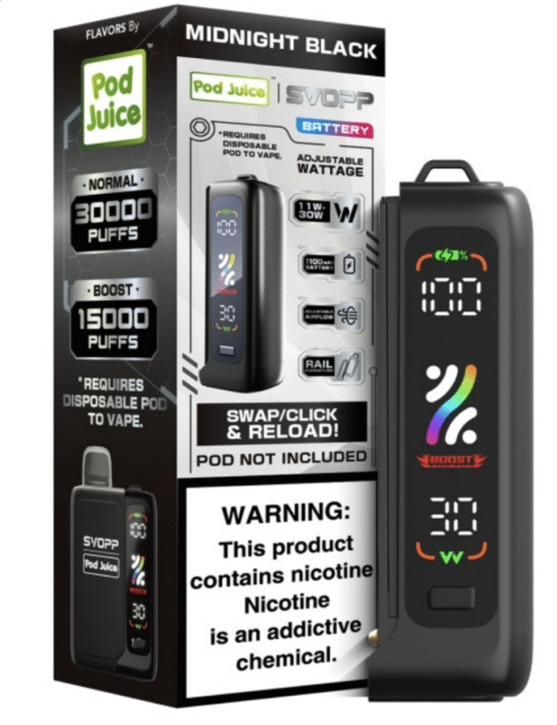 The Svopp Pod Battery by OXBAR x Pod Juice combines power and versatility with its 1100mAh rechargeable battery, offering up to 30,000 puffs in normal mode and 15,000 in boost mode. Equipped with six adjustable wattage levels, users can customize their vaping experience for both flavor and vapor production. The large MEGA LED screen displays essential information, while the draw-activated operation ensures intuitive use. Adjustable airflow supports both RDL and MTL styles, complemented by UNIONE Dual Mesh Hyper Coils for enhanced flavor.