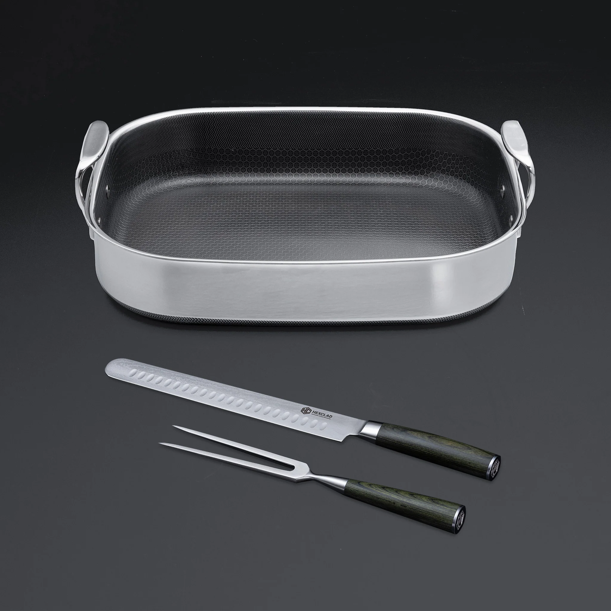 The $379.99 deal includes the HexClad Hybrid Roasting Pan and the HexClad Japanese Damascus Steel Carving Set. The Hybrid Roasting Pan boasts patented hybrid technology, ensuring even heat distribution for flawless roasting and baking. It’s durable enough for use with metal utensils and features a nonstick surface for easy cleaning. The included rack prevents meat from touching the pan’s bottom, allowing drippings to fall through. Its versatility allows seamless transition from stovetop to oven, making it perfect for various dishes. The Japanese Damascus Steel Carving Set comprises a knife and fork crafted from 67 layers of high-quality steel, ensuring a harder blade (60 Rockwell Rating) for effortless slicing and long-lasting sharpness. The knife’s design prevents accidental meat puncturing, preserving flavorful juices. The fork securely holds meat for precise cutting, while ergonomic pakkawood handles ensure easy handling.