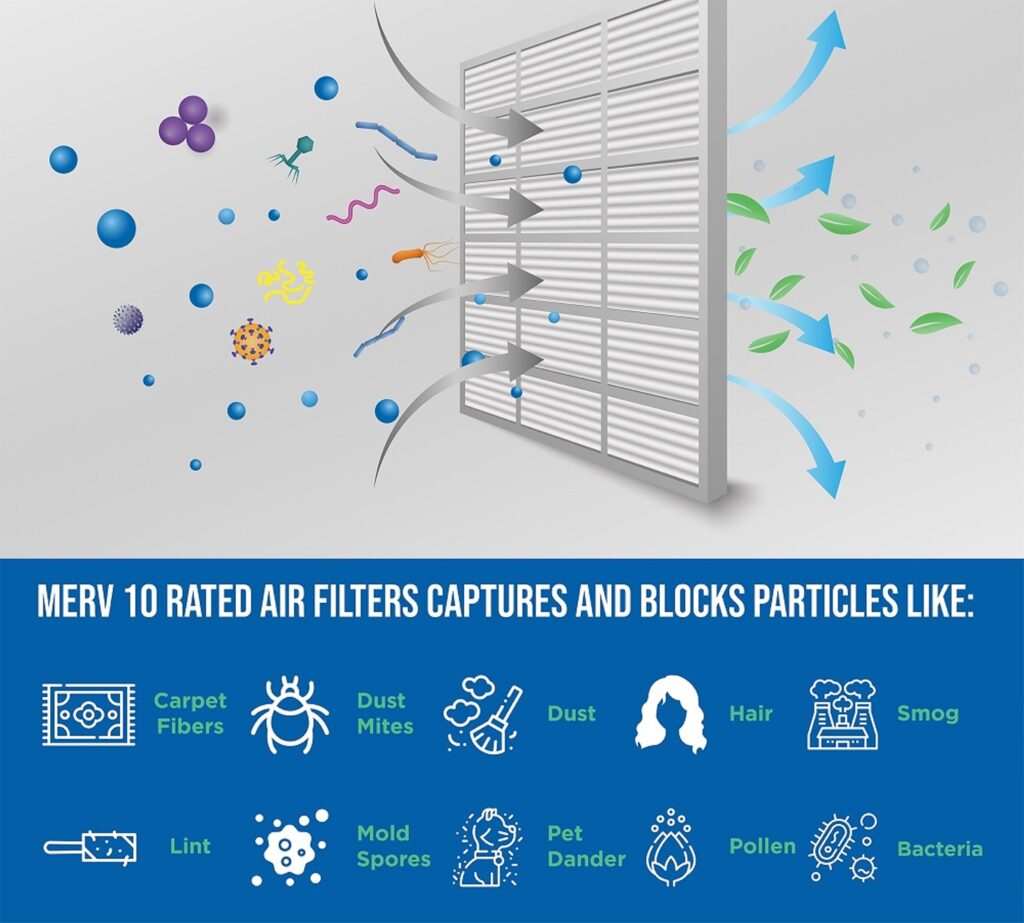 - MERV 10 Rating: Traps dust, pollen and pet dander to have cleaner air.