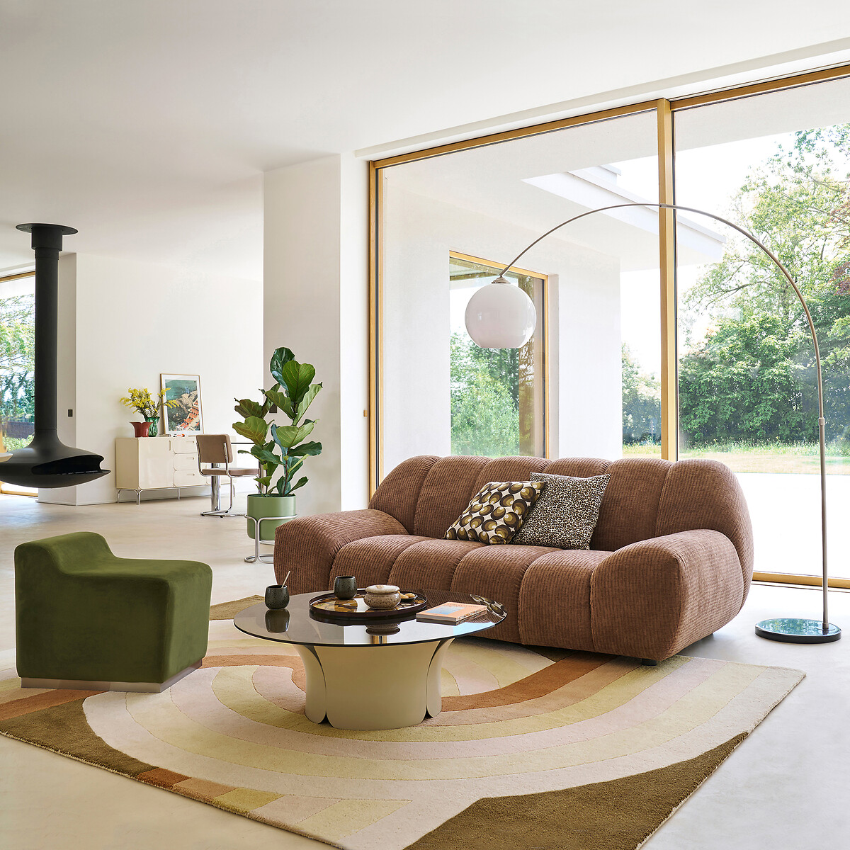 El sofá Nuria de 3 plazas de terciopelo evoca al instante una época de diseño llena de curvas audaces y proporciones acogedoras. Inspirado en los interiores de los años 70, su altura es baja, creando una presencia íntima similar a la de un salón, donde la relajación es el tema central. Su tapizado de terciopelo chenilla acanalado aporta calidez al tacto, mientras que las costuras acolchadas realzan su estética escultural. El equilibrado soporte del asiento y el respaldo garantiza una sensación de confort tan agradable como estética. Fabricado con una sólida estructura de haya maciza, tableros de partículas y tableros de fibra, este mueble combina durabilidad con un toque artístico. Sus dimensiones (212 cm de largo, 79 cm de alto y 106 cm de fondo) lo hacen lo suficientemente espacioso para tres personas sin sobrecargar la habitación.