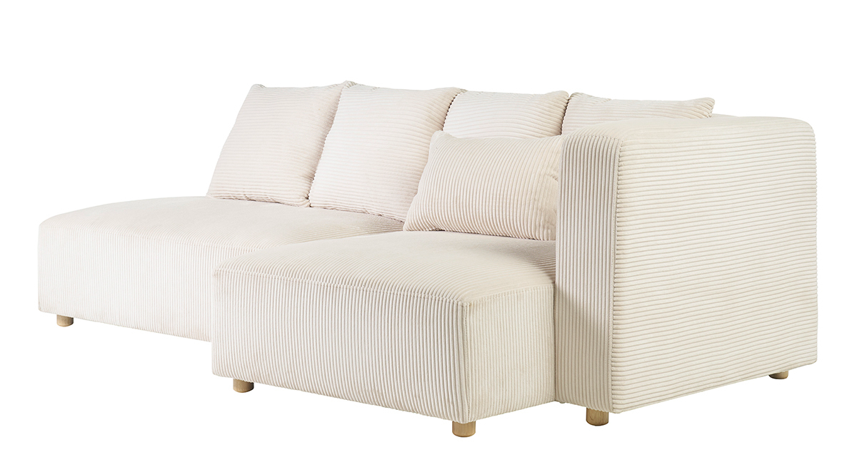 Sofá esquinero derecho de 3 plazas HARLEM en tejido de pana beige y madera clara