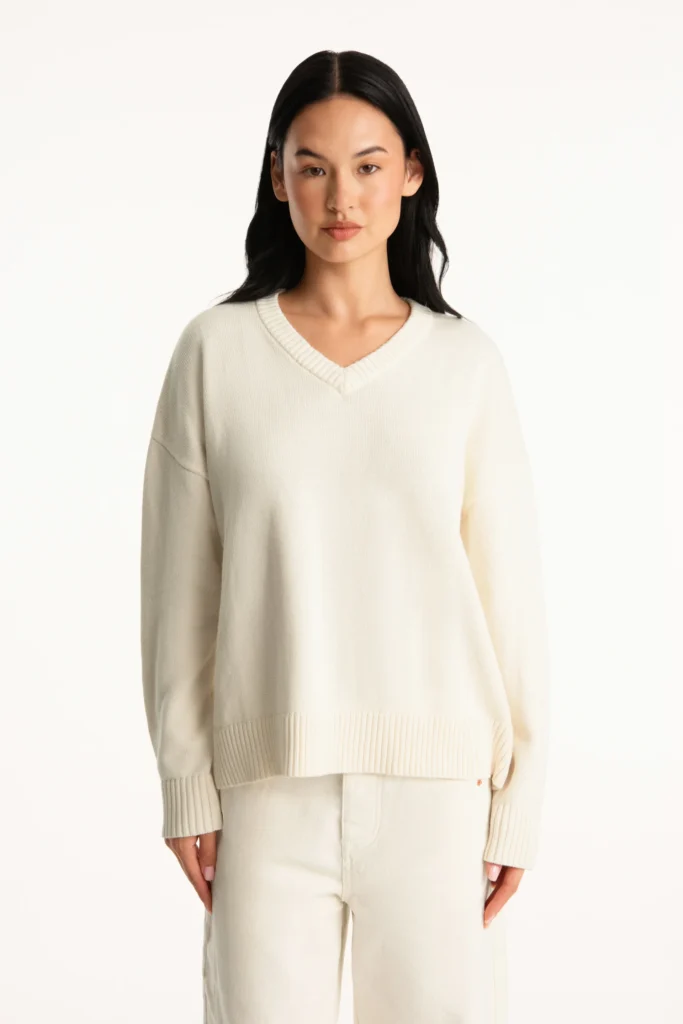 This beautifully designed v-neck piece gives an ideal combination of gentleness and contemporary minimalism. It captures a casual elegance that moves in both directions between carefree mornings and elegant evenings in its oversized silhouette. The cotton fabric provides a breath of comfort, and the v-neckline generates some level of sophistication that makes this piece of apparel timeless. The full-length and the dropped shoulders form a loose drape, which is perfect in layering or standalone. This sweater is a style that is made to please both the form and the freedom and all seasons, making it a wardrobe staple.