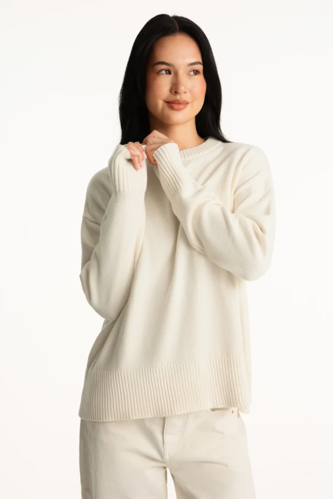 This bouclé piece gives warmth and texture to the foreground, demonstrating that comfort is also artful. This style has been developed based on the use of a comfortable bouclé fabric that has excellent texture and stretchability, which envelops softness and light volume. Its loose sleeves and the dropped shoulders make it an easygoing garment and the crew neckline makes it balanced. It is ideal in colder seasons and makes a wearer feel like a cocoon containing the warmth without losing elegance.