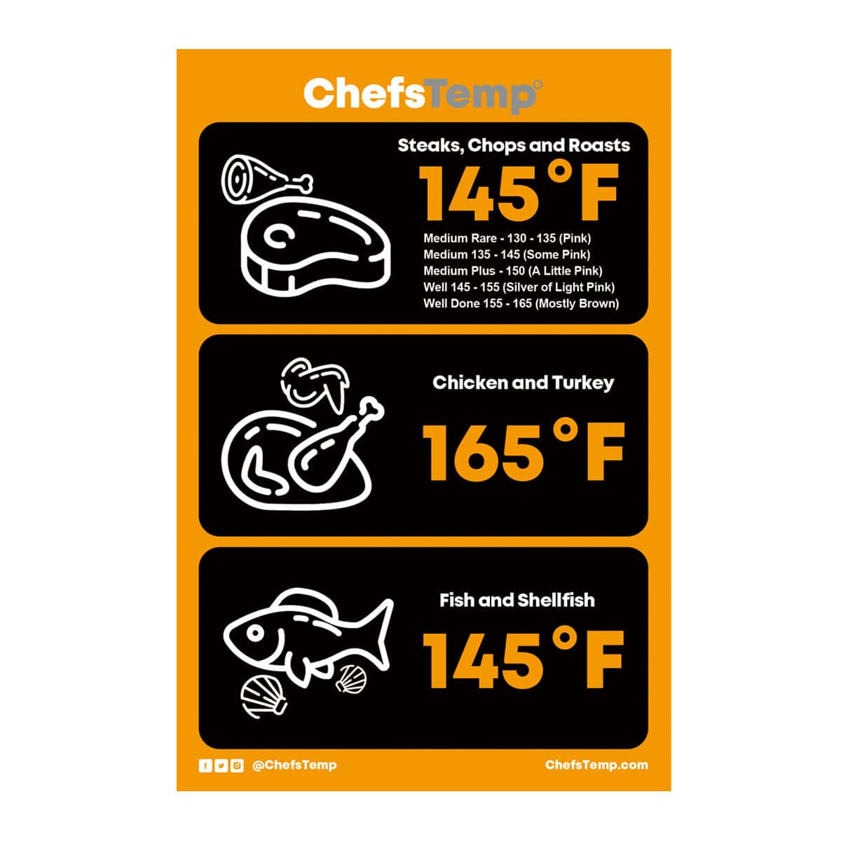 - Displays safe cooking temperatures for beef, pork, poultry, and seafood.