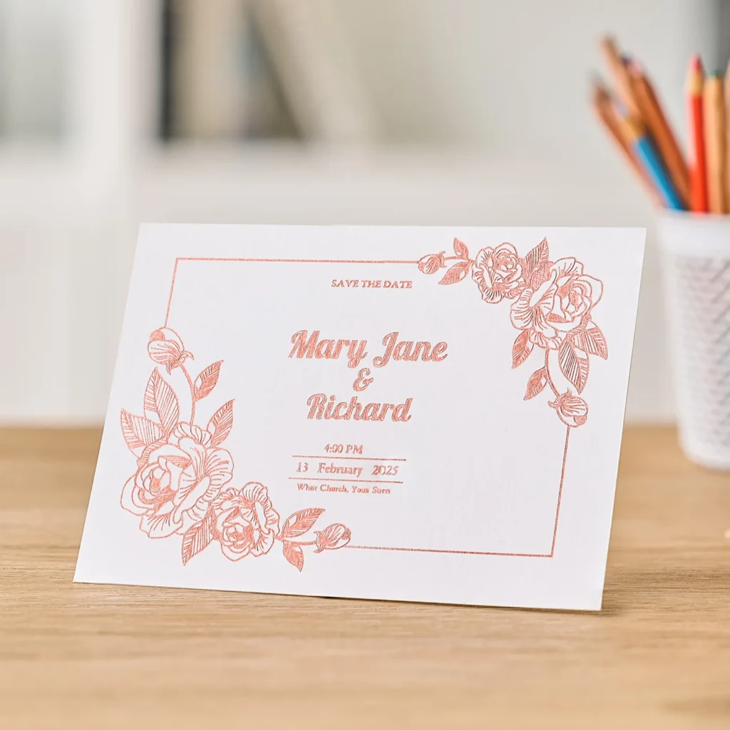 - Dual foil colours: 10 sheets of rose gold and red foil.