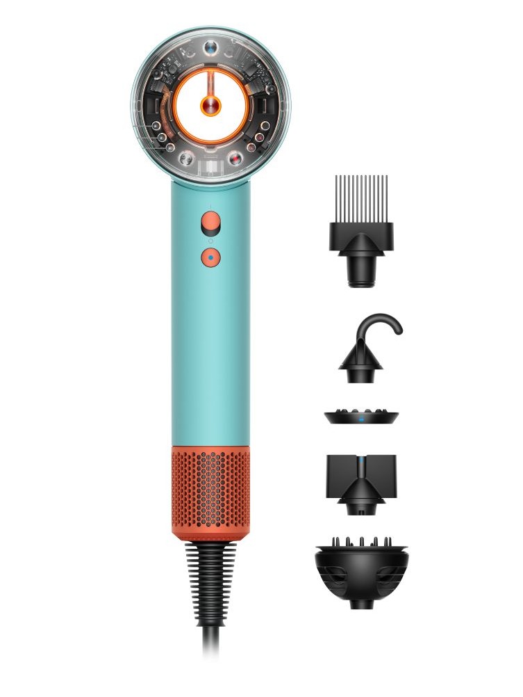 Secadora Dyson Supersonic Nural | Con pátina cerámica/Topaz, se adapta automáticamente al cabello y al cuero cabelludo, manteniendo temperaturas óptimas y aprendiendo tus preferencias de peinado. Sus cinco accesorios inteligentes optimizan el flujo de aire, y el modo de protección del cuero cabelludo mantiene la temperatura cerca del cuero cabelludo por debajo de 55 °C. Un acelerómetro detecta la inactividad para ahorrar energía y evitar el sobrecalentamiento.