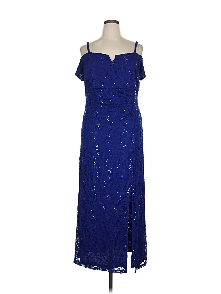Candalite Cocktail Dress The long sleeveless style has cold shoulder cuts and has a touch of glitter in it. It is made out of 55% nylon, 38% polyester and 7 percent spandex that is comfortable to stretch as well as fit well. The palette of the blue color is sophisticated to the formal evening events. It is practically new and offers the sense of luxury without sacrifices.