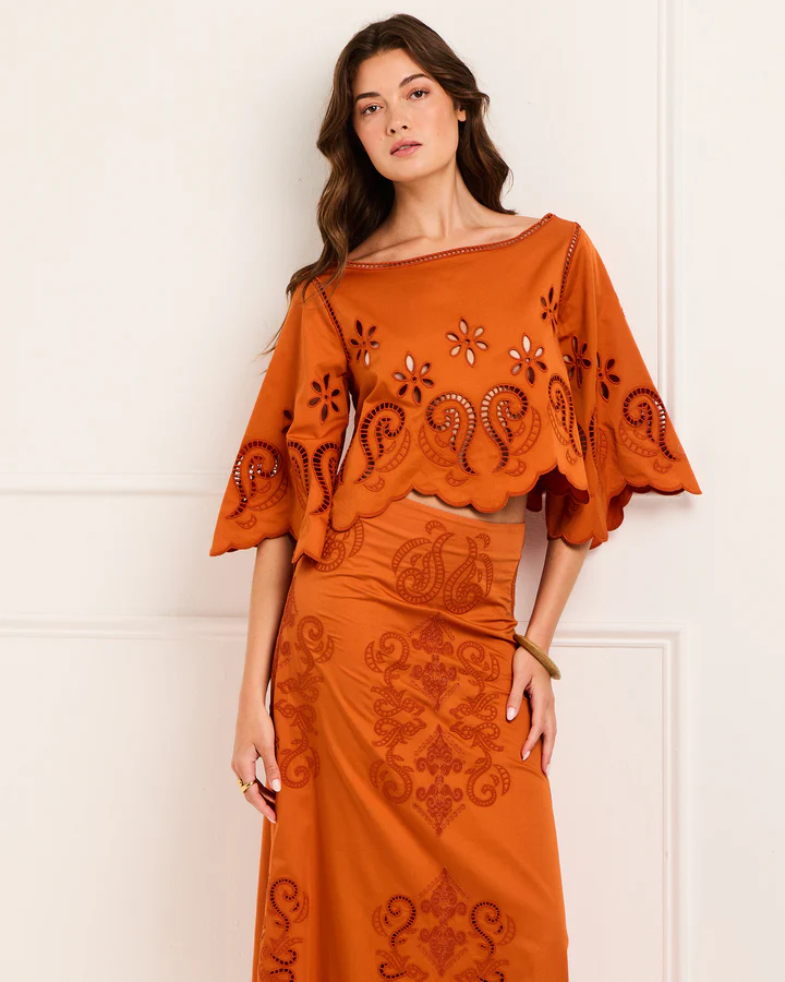 The Seline Top and customized pants or skirts will be a modern compromise between form and style. The lightweight cotton fabric of the garment makes it ideal to wear as a layer, and the embroidered and cut-work details serve as a touch of exquisite detail, which makes it stand out among simple tops. The strong design can be easily accessorized, whether it is a simple piece of jewelry or an accent, which increases the versatility of the top in various combinations.
