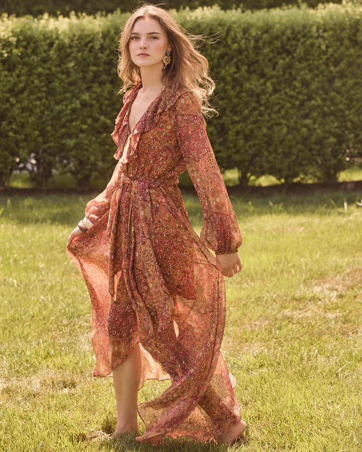 The Aspen Dress can be worn to the brunch, evening events, or as a casual day out, which is why it combines both the high-end design and comfort in movement. The layered skirt also gives a touch of playfulness, and the peasant sleeves are also elegant and do not affect the comfort. The use of kaleidoscope paisley design in cinnamon brown gives it a warm and artistic appeal that could easily be mixed with other accessories and outerwear, making it a wardrobe staple that feels new and customized.