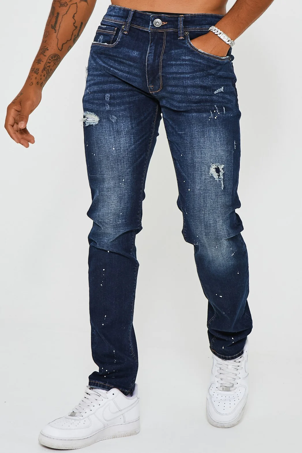 These jeans are relaxed on the thigh, slim on the calf, and taper at the ankle, creating a unique and stylish silhouette. The dark blue denim features a washed effect with a paint splatter print design, giving it a trendy and edgy look. The 5-pocket construction provides functionality, and the jeans are lightly faded and distressed for that sought-after worn-in appearance.